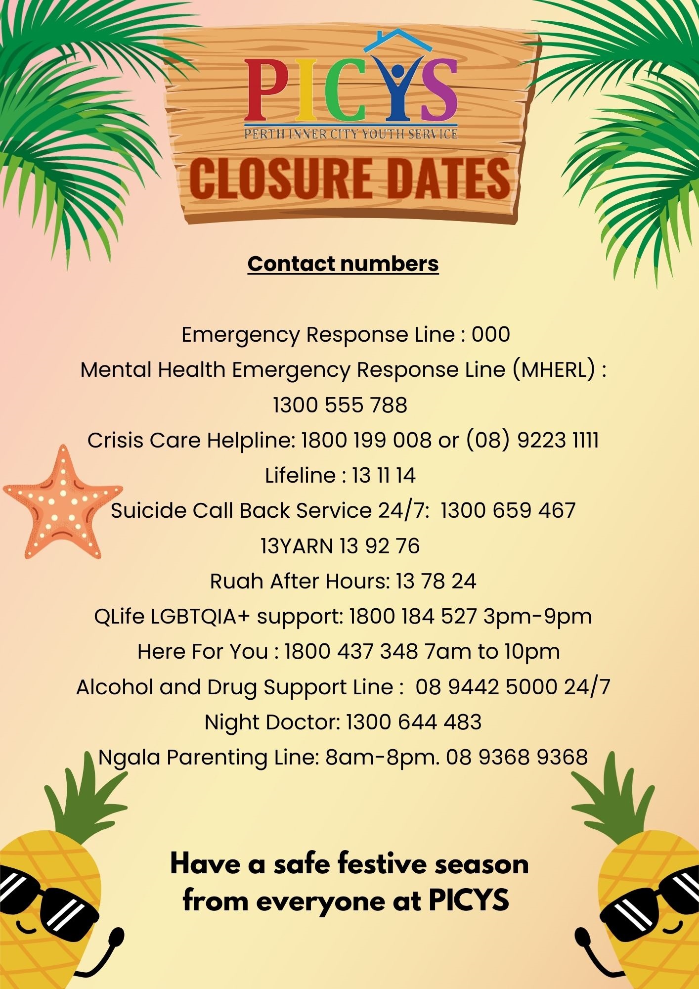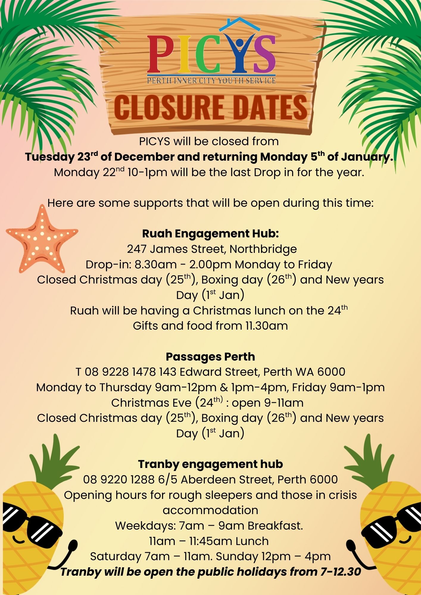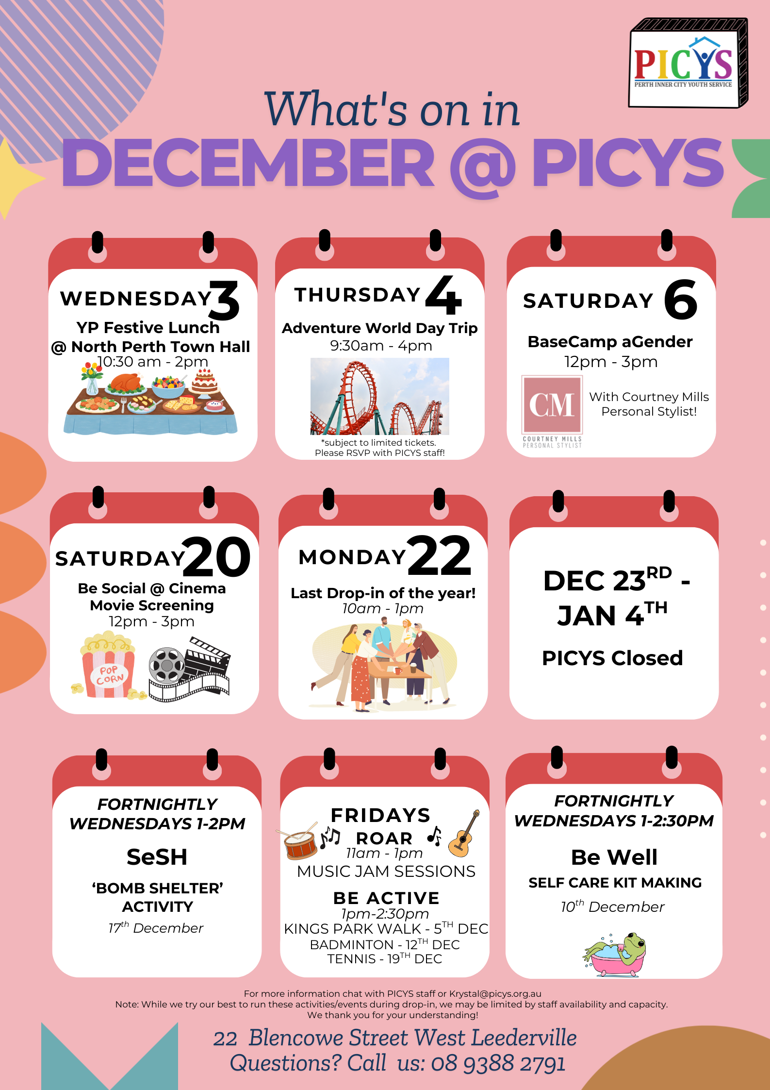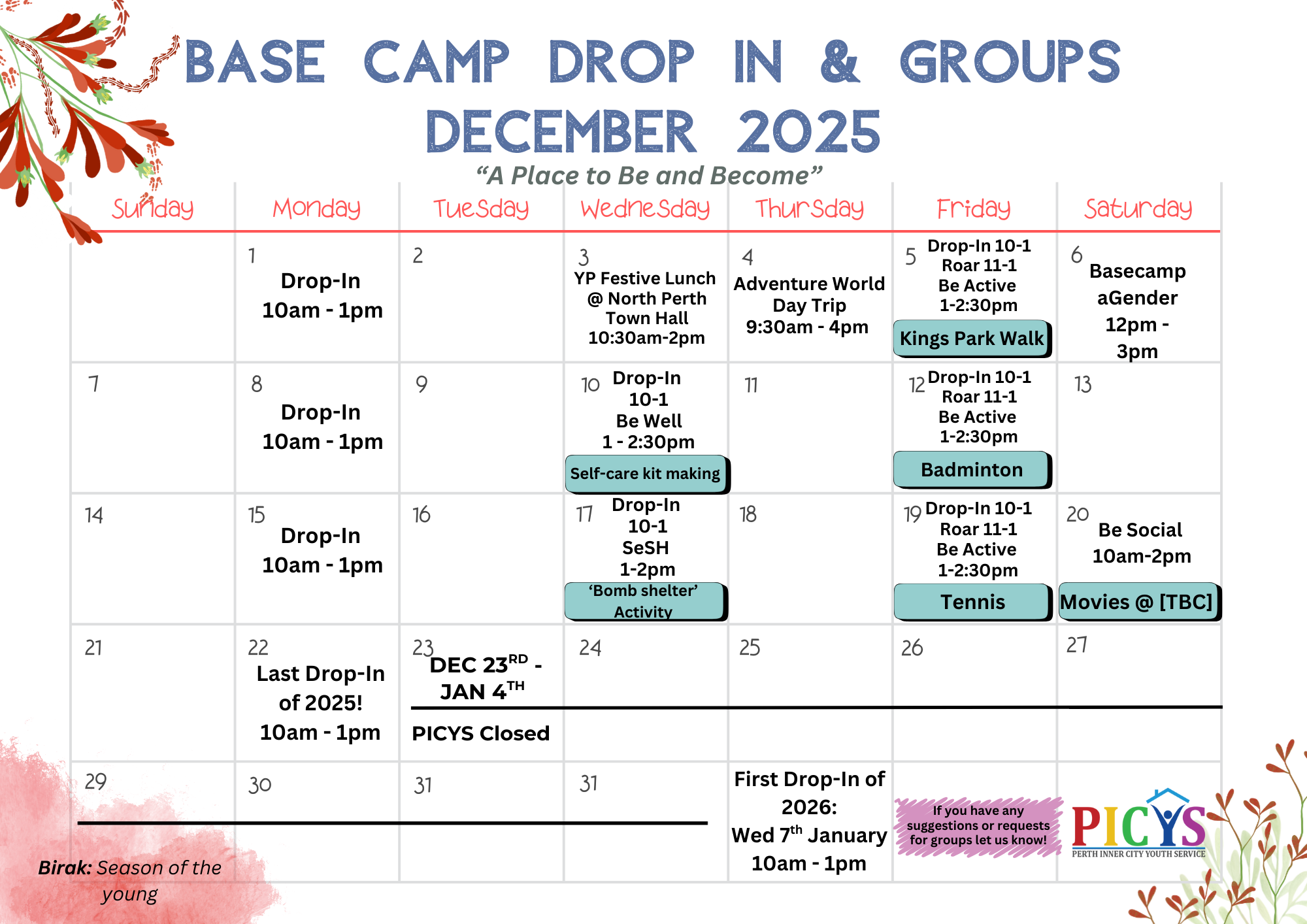 PICYS BaseCamp drop in open times are 10am and 1pm on Mondays, Wednesdays and Fridays (except public holidays). Drop in to connect with PICYS staff and other young people with similar experiences in a safe and supportive environment, enjoy a meal, get Emergency Relief (ER) supplies to stretch the weekly budget, use the computer, laundry and bathroom facilities, play an instrument or do some craft.